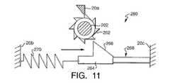 形状記憶素子246は、ホイール244内の横断路250を通って伸長する細長いワイヤーからなり、ばね248は、通常、図8に示すように帯電していない長さの形状記憶素子が曲がるように該ホイールを偏らせる。帯電していない長さから帯電した長さへと縮小する形状記憶素子246は、帯電した長さの形状記憶素子をまっすぐにし、図9に示すように、ホイール244を、ばね248のバイアス(ばねによる偏り)に抗して第1方向に回転させる。電荷が除去されると、ばね248は、ホイール244を偏らせ、形状記憶素子246の長さを伸ばし、図8に示すように帯電していない長さの形状記憶素子を曲げる。  The