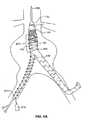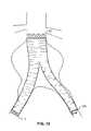 別の実施形態では、グラフトの第1端部を大動脈に固定するために、異なる手段を有する。一般的に、固定化手段は、固定化手段を大動脈内へ経管腔内内挿的に送達可能とする、第1直径、および、グラフトの第1端部を大動脈に固定するための、膨張した、第2直径を有する。好ましい固定化手段は、バルーン膨張性ステントである。本発明に係るデバイスで用いられているステントは、完全なる自己膨張性を有するものではない。むしろ、完全にバルーン膨張可能でよく、または、部分的に自己膨張可能であり、かつ、部分的に(例えば、バルーン等によって)手動的に膨張可能であってもよい。ステントは、ステントおよびグラフトを半径方向に膨張した構成に膨張する半径方向膨張手段を用いて完全に留置される。 In another embodiment, there are different means for securing the first end of the graft to the aorta. In general, the immobilization means is a dilatation for securing the first diameter and the first end of the graft to the aorta, allowing the immobilization means to be transluminally inserted into the aorta. And has a second diameter. A preferred immobilization means is a balloon expandable stent. The stent used in the device according to the present invention is not completely self-expanding. Rather, it may be fully balloon inflatable, or it may be partially self-expandable and partially manually expandable (eg, by a balloon or the like). The stent is fully deployed using a radial expansion means that expands the stent and graft into a radially expanded configuration.