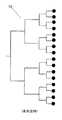 図9は、従来技術から公知の典型的な配置である、複数の円形パッチを用いたリニア16素子アレーのための共通給電ネットワークの概略図(13)である。 FIG. 9 is a schematic diagram (13) of a common feed network for a linear 16-element array using a plurality of circular patches, which is a typical arrangement known from the prior art.
