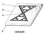図1は基本的な放射マルチレベル素子(1)の一例を示し、これは、同一の周波数で動作する古典的なユークリッド幾何学に基づいたパッチ(正方形、円形形状など)の指向性より強い指向性を有するブロードサイド放射パターンを達成する。パッチは、例えば誘電体基板(2)上にプリントされることが可能であり、又は例えば、レーザプロセスを用いるように適合されることも可能である。誘電体基板上にマルチレベル素子又は空間充填素子をパターン形成するためには、既知のプリント回路製造技術のうちの任意のものを適用することができる。上記誘電体基板は、例えば、ガラスファイバ板、テフロンをベースとする基板(カクラッド(Cuclad:登録商標)等)、又は他の標準的な高周波基板及びマイクロ波基板(例えばロジャーズ4003(Rogers4003:登録商標)又はカプトン(Kapton:登録商標)等)であることが可能である。図1に示したアンテナの動作は、[ジェイ.アングエラ,シー.プエンテ,シー.ボルハ,アール.モンテロ,ジェイ.ソレル,「シェルピンスキーフラクタルに基づいた小型かつ高指向性のボウネクタイ型パッチアンテナ」,マイクロウェーブ・アンド・オプティカル・テクノロジー・レターズ,vol.31,no3,pp.239−241,2001年11月]においてすでに公開されている。 FIG. 1 shows an example of a basic radiating multilevel element (1), which is stronger than the directivity of a patch (square, circular shape, etc.) based on classical Euclidean geometry operating at the same frequency. To achieve a broad-side radiation pattern. The patch can be printed, for example, on a dielectric substrate (2) or can be adapted, for example, to use a laser process. Any of the known printed circuit manufacturing techniques can be applied to pattern multilevel elements or space filling elements on a dielectric substrate. The dielectric substrate is, for example, a glass fiber plate, a Teflon-based substrate (Cuclad (registered trademark) or the like), or other standard high-frequency substrate and microwave substrate (for example, Rogers 4003 (registered trademark)). ) Or Kapton (registered trademark) or the like. The operation of the antenna shown in FIG. Anguela, Sea. Puente, Sea. Borja, Earl. Montero, Jay. Sorell, “Small and highly directional bow-tie patch antenna based on Sherpinski fractal”, Microwave and Optical Technology Letters, vol. 31, no3, pp. 239-241, November 2001].