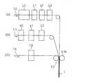 一方、接着剤層形成部(60)、白色印刷層形成部(61)、個別情報形成部(62)およびニップロール(63a)でなるラミネート部(63)を備えたラミネーター(300)を用い、走行する中間基材層としてのバリアフィルム(17)の表面の、切取り部を構成する領域以外に接着剤層を形成し、この切取り部を構成する領域には白色印刷層を形成し、この白色印刷層上に個別情報を形成し、これら各層が形成されたバリアフィルム(17)を間に挟むように上記グラビア印刷機(100)で各層が形成された印刷基材フィルム(10)と、表面全面に接着剤層を形成する接着剤層形成部(60)を備えたラミネーター(200)を用い、接着剤層が形成されたシーラントフィルム(16)とをラミネートする3層構成の切取り部付包装材料の製造方法で、グラビア印刷機(100)と2基のラミネラミネーター(300、200)とがインラインで連結しているインライン印刷ラミネーターを用いた製造方法とすることもできる。 On the other hand, a laminator (300) provided with a laminating part (63) comprising an adhesive layer forming part (60), a white printed layer forming part (61), an individual information forming part (62) and a nip roll (63a) An adhesive layer is formed on the surface of the barrier film (17) as an intermediate base material layer other than the region constituting the cut-out portion, and a white print layer is formed on the region constituting the cut-out portion. A printing substrate film (10) in which each layer is formed by the gravure printing machine (100) so that individual information is formed on the layer and the barrier film (17) in which each layer is formed is sandwiched therebetween, and the entire surface A laminator (200) provided with an adhesive layer forming part (60) for forming an adhesive layer on the laminator (200) and laminating the sealant film (16) with the adhesive layer formed thereon has a three-layer cut-out part In the production method of instrumentation material may be a manufacturing method using an in-line print laminator gravure printing machine (100) and the 2 groups of La mineralocorticoid laminator (300, 200) are connected in-line.