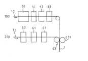 また、上記請求項4および請求項6に係る発明は、上記の切取り部付包装材料の製造方法であって、例えば、図5の側面概略図に示すように、絵柄印刷部(50)、白色インキ層印刷部(51)、遮光インキ層印刷部(52)およびミシン目形成部(53)を備えた