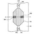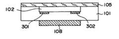 また、この発明による第1のDNA増幅装置においては、図3および4に示すように、反応セル 102の底面に1つもしくはそれ以上の温度検出手段 301および 302を設けることができる。ここで、図3はこの発明による第1のDNA増幅装置の別の具体例を模式的に示す平面図であり、図4は図3に示される装置のB−B線に沿った断面を模式的に示す図である。なお、図3および4において、図1および2と同じ部材には同一の符号が付されており、以下の図面においても同一の符号は同一の部材を表わすことを原則とする。温度検出手段 301および 302としては、例えば、熱電対、ダイオード等を用いることができる。  In the first DNA amplification device according to the present invention, as shown in FIGS. 3 and 4, one or more temperature detecting means 301 and 302 can be provided on the bottom surface of the