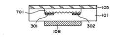 同様の効果は、図7および8に示すように、反応セル 102の代わりに底面の断面形状が鋸刃状もしくは波状である反応セル 701を用いることによっても達成することができる。ここで、図7はこの発明による第1のDNA増幅装置のさらに別の具体例を模式的に示す平面図であり、図8は図7に示される装置のD−D線に沿った断面を模式的に示す図である。図7および8に示す装置においても、反応セル底面の表面積が増大し、基板 101の裏面に設けられた発熱体 108が発生する熱を、反応セル 701内の反応溶液に効率よく伝えることができる。したがって、図5および6に示される装置と同様に、DNA増幅反応に要する時間を短縮し、熱サイクルの温度をより精密に制御することが可能となる。反応セル 701の断面形状が鋸刃状もしくは波状の底面は、図5および6に示される装置と同様に、反応セル 701を形成する際に同時にその形状を形成してもよく、あるいはまずプレーナー状の反応セルを形成した後に断面形状を鋸刃状もしくは波状に加工してもよいが、基板 101と同一の材質であることが好ましい。  Similar effects can also be achieved by using a