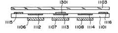 次に、この発明による第2のDNA増幅装置の一具体例の平面図を図11に、また図11に示されるDNA増幅装置のF−F線断面図を図12にそれぞれ模式的に示す。この装置では、無機もしくは有機基板1101上に、2つの弁1104および1105が設けられた流路1102が形成され、その上面に透明基板1103が接合されている。弁1104と1105との間には、基板1101の裏面に接して3つの発熱体1106、1107および1108が設けられており、それぞれ発熱体の温度を個別に制御する発熱体制御装置1109、1110および1111に接続されている。また、これらの発熱体1106、1107および1108に対応して流路1102の底面には、それぞれ、反応溶液の温度を検出するための温度検出手段1112、1113および1114が設けられている。さらに、弁1104と発熱体1106の間に位置する流路1102の底面および弁1105と発熱体1108の間に位置する流路1102の底面には、それぞれ電極1115および1116が設けられ、いずれも、電極に電圧を印加することが可能であり、かつ印加した電圧を反転することが可能な電圧制御装置1117に接続されている。無機もしくは有機基板1101の材質、流路1102の形成方法、透明基板1103の材質、利用可能な発熱体、および利用可能な温度検出手段は全て、上記この発明による第1のDNA増幅装置に用いられるものと同様である。  Next, a plan view of a specific example of the second DNA amplifying apparatus according to the present invention is schematically shown in FIG. 11, and a cross-sectional view taken along line FF of the DNA amplifying apparatus shown in FIG. 11 is schematically shown in FIG. In this apparatus, a
