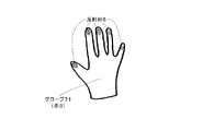 図3に示すように、本実施例では、モニタ9上に複数ページで構成されたテキストの電子画像7をモニタ9前のユーザー(ここでは、手3として示す)が操作を行う。始めに複数ページのテキストの電子画像7をめくる操作について説明する。図4に示すように、ユーザーはジェスチャを行う各指にサック5a〜5e(以下簡単のためサック5とも記す)を装着する。サック5の特徴的な部位(各指先、はら、関節など)の任意の個所には、電磁波発信器から照射される電磁波に対して夫々反射特性の異なる物質6a〜6e(以下簡単のため反射材6とも記す)が付着されている。本実施例では、反射材6として誘電体材料で作成された多層膜を用いていて、電磁波発信器から照射される電磁波に対する反射特性を変化させるため、例えば多層膜の層数を変えたり、誘電体材料の組成を変えたりして、夫々異なる部位に付着してある。これにより、各部位と反射電磁波が一対一に対応して、受信側で各部位が同定できることになる。また、対象が1つである場合にも、それと認識できることになる。As shown in FIG. 3, in this embodiment, a user in front of the monitor 9 (shown here as a hand 3) operates a text electronic image 7 composed of a plurality of pages on the monitor 9. First, an operation of turning the electronic image 7 of a plurality of pages of text will be described. As shown in FIG. 4, the user wears sacks 5a to 5e (hereinafter also referred to as sack 5 for simplicity) on each finger to perform a gesture. Substances 6a to 6e having different reflection characteristics with respect to the electromagnetic waves irradiated from the electromagnetic wave transmitters (hereinafter referred to as reflective materials for the sake of simplicity) are placed at arbitrary portions of the characteristic portions of the sack 5 (each fingertip, bar, joint, etc.) 6) is attached. In this embodiment, a multilayer film made of a dielectric material is used as the reflector 6 and the reflection characteristics for electromagnetic waves irradiated from the electromagnetic wave transmitter are changed. The composition of the body material is changed, so that it is attached to different parts. Thereby, each part and reflected electromagnetic waves correspond one-to-one, and each part can be identified on the receiving side. Further, even when there is one target, it can be recognized.