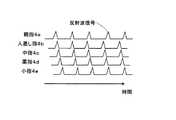 ここで、例えば複数ページで構成されたテキスト画像7を3ページ分めくる操作について説明する。まず、ユーザーは、テキスト画像7の端部が表示されている領域の方に手3を移動させる。図3に示す様に、例えばテキスト画像7の左下の方に右手3を移動させ、親指4aのみを、めくるような払う動作で動かす。この時、各指の反射材6によって生成された反射波を電磁波受信手段の一つで検出した受信信号の概形の一例を図5に示す。電磁波受信器で受信される信号は、各反射材6が反射波を生成した3次元空間中の位置に応じて、検出される時刻が異なるため、それに基づいて反射材6の3次元空間における位置が算出される。図5では、受信信号は同じように描かれているが、実際は各指の反射材6によって異なるので、反射材6を識別することによって各指の3次元空間における位置が算出される。この算出方法としては、例えば、電磁波発信器から外に発信されたパルスとは別に、遅延器で電磁波発信器からのパルスのタイミングを遅延させ、遅延器によって遅延させられた電磁波パルスと受信パルス(これは、電磁波発生器からのパルス発生から各部位に応じた時間だけ遅延して受信される)をミキサでミキシングして受信パルスの遅延時間を検出し、演算器でこの遅延時間から人物の各部位までの3次元位置情報(例えば、3次元位置情報の距離と方向のうち、距離とは、反射してくる電磁波を検出する検出部に対する対象物との距離であり、また方向とは反射してくる電磁波を検出する検出部の傾きから算出された方向である)を算出する。Here, for example, an operation of turning a text image 7 composed of a plurality of pages for three pages will be described. First, the user moves the