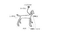 図9に、本装置を犬25に適用した場合の概観を示す。犬25の身体の手足、首、耳、口などの各部位に反射材6が付着した粘着シール13を貼り付ける。犬25は首輪92に結ばれたロープ91によって繋がれ、人間はロープ91の一端に装着されたハンドル93を保持する。例えば、前記電磁波発信器、電磁波受信器、スピーカなどの少なくとも1つをハンドル93に設けることも可能である。FIG. 9 shows an overview when the present apparatus is applied to a dog 25. An adhesive seal 13 with a reflective material 6 attached is attached to each part such as a limb, neck, ear, and mouth of the body of the dog 25. The dog 25 is connected by a rope 91 connected to a collar 92, and a human holds a handle 93 attached to one end of the rope 91. For example, at least one of the electromagnetic wave transmitter, the electromagnetic wave receiver, the speaker and the like can be provided on the handle 93.