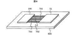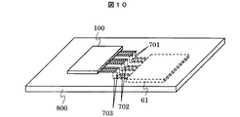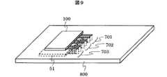 図9は本発明による送受信装置の実施例5を示す構造図である。本実施例も、マルチバンドに対応した場合の実装形態の一例である。実装基板800に高周波フロントエンドモジュール100とダイレクトコンバージョンレシーバ51を各々反対の面に実装する場合を考える。このとき、各々の端子を図9に示す如く透視図上で対向配置となるようにする。これにより、両面実装を行う場合、高周波信号線701、702、703が交差することなく短距離で結線できる。また、各実装面の高周波信号線どうしをviaで接続しているが、viaは寄生インダクタンス成分を有するため、その配置によって信号遅延や振幅のインバランス要因となるため好ましくない。本実施例によれば、配線レイアウトを簡略できるためレイアウトの自由度が増し、平衡信号に対する寄生インダクタンス成分の影響を抑圧することができる。 FIG. 9 is a structural