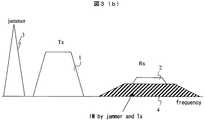 図3(b)の場合、受信チャネルに生じる送信信号1と妨害信号3による相互変調妨害4は図3(a)の同信号の2倍の帯域幅を有する。When the frequency of the