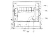 次に、ロール紙保持装置20におけるロール紙60の位置決めのための構成について説明する。図6は、ロール紙保持装置部分を示す斜視図であり、図7は、印刷装置を平面図に近い斜め上方からみた外観斜視図である。図6は、図2の反対側(図2の矢印B方向)からみたロール紙保持装置を示す印刷装置の部分斜視図であり、ロール紙60及び保持軸30のいずれも装着していない状態を示している。図8は、図6の矢印C方向からみたロール紙保持装置の背面図であり、図9は、ロール紙がセットされた状態のロール紙保持装置の背面図である。図9においては、径の大きなロール紙60がセットされているときの接触部材15の位置を示しており、保持軸30及びロール紙60の一部を破線で示している。 Next, a configuration for positioning the