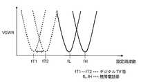 図9は、デジタルTV帯で動作するときの複合アンテナのVSWR特性図である。実線で示されるのが、デジタルTV帯である。給電端子18での共振周波数は、誘導性素子13により、fLの共振周波数が低い周波数帯に移行すると共に同調回路14により可変される。この結果、同調する周波数fT1〜fT2を得る。このとき、fL,fHの共振は、破線で示されるように、現れない。 FIG. 9 is a VSWR characteristic diagram of the composite antenna when operating in the digital TV band. The solid line shows the digital TV band. The resonance frequency at the