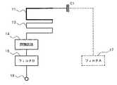 フィルタA17は、携帯電話帯の周波数と共振する一方、デジタルTV帯の周波数の信号に対しては開放端となり得るほどの高インピーダンス回路として作用するように設定されるフィルタである。このようなフィルタの構成例の一例を図4に示す。図4(a)は、共振周波数帯において高インピーダンスになる並列型、図4(b)は、共振周波数帯のみ低インピーダンスとなる直列型、図4(c)は、複数の共振周波数帯で低インピーダンスとなる直並列型等が使用できる。フィルタA17は、集中定数素子又は分布定数素子で構成される。集中定数素子は、表面実装素子であってもよい。このフィルタA17の一端は結合素子に接続され、その他端は、給電端子19に接続される。 The filter A17 is a filter that is set so as to act as a high impedance circuit that can resonate with the frequency of the digital TV band while being resonated with the frequency of the mobile phone band and can be an open end. An example of a configuration example of such a filter is shown in FIG. 4A is a parallel type in which high impedance is obtained in the resonance frequency band, FIG. 4B is a series type in which only the resonance frequency band is low impedance, and FIG. 4C is low in a plurality of resonance frequency bands. A series-parallel type that provides impedance can be used. The filter A17 is composed of a lumped constant element or a distributed constant element. The lumped element may be a surface mount element. One end of the