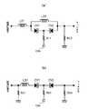 並列回路とフィルタB16との間は、抵抗R12を介してアースラインに接続される。高抵抗R11は、高周波的に高インピーダンスになるようなインダクタンス素子でも構わない。In the circuit of FIG. 5A, a first inductance element L21 and a second inductance element L22 connected in series to the first inductance element L21 are provided between the inductive element and the filter B16. And a parallel circuit of variable capacitance elements, and a control terminal CON for supplying a control signal voltage to the variable capacitance elements via a resistor R11 for reducing the influence on high frequency. The resistor R11 has a resistance of several kΩ (for example, 10 kΩ).