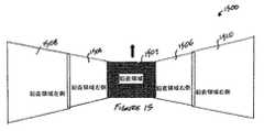取付部材(318)が永久的に固定されている(例えば溶接)場合、アパーチャ(320)、カメラとそれらの視線との空間的関係は、画像領域(326)(328)(332)(336)(340)の空間的関係と同様、固定されたままである。そのような構造は、例えば衛星監視のように、カメラアレイアセンブリ(300)が、領域(322)から本質的に一定の距離に維持される用途に好ましい。カメラの位置と調整は、領域(326)(328)(332)(336)(340)が、領域(322)の全体をイメージングできるように設定される。取付部材(318)が一時的な固定又は調節可能である場合、画像領域(326)(328)(332)(336)(340)が狭く又は広くなるように移動できるように、カメラの位置又は配列を、手操作又は遠隔からの自動操作により選択的に調節できることが好ましく、これによって、カメラアレイアセンブリ(300)によって収集された画像の質を向上させたり、変えることができる。 When the mounting member (318) is permanently fixed (e.g., welded), the spatial relationship between the aperture (320), the camera and their line of sight is the image area (326) (328) (332) (336) Like the (340) spatial relationship, it remains fixed. Such a structure is preferred for applications where the camera array assembly (300) is maintained at an essentially constant distance from the region (322), such as satellite surveillance. The position and adjustment of the camera are set so that the region (326) (328) (332) (336) (340) can image the entire region (322). If the mounting member (318) is temporarily fixed or adjustable, the position of the camera or the image area (326) (328) (332) (336) (340) can be moved so that it is narrower or wider. Preferably, the array can be selectively adjusted by hand or remote automatic operation, which can improve or alter the quality of the images collected by the camera array assembly (300).