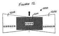 図3に示すように、イメージングセンサー(310)は、ハウジング(304)内で軸(316)に沿って中央に配置されている。イメージングセンサー(310)の焦点軸(324)は、センサーの視線が領域(322)の画像領域(326)と揃うように、ハウジング(304)と直交している。イメージングセンサー(308)は、ハウジング(304)内で、軸(316)に沿ってイメージングセンサー(310)の隣りに配置されている。イメージングセンサー(308)の配置は、その視線が領域(322)の画像領域(328)と一致するように、また、その焦点軸(330)が集束し、アパーチャ(320)が境界をなす領域内で軸(324)と交差するように調整されている。イメージングセンサー(312)は、ハウジング(304)内で、イメージングセンサー(310)の隣りでセンサー(308)とは反対側に軸(316)に沿って配置される。イメージングセンサー(312)の配置は、その視線が領域(322)の画像領域(332)と一致するように、さらにその焦点軸(334)が集束し、アパーチャ(320)が境界をなす領域内で軸(324)(330)と交差するように調整されている。イメージングセンサー(306)は、ハウジング(304)内で、軸(316)に沿ってセンサー(308)の隣りに配置されている。イメージングセンサー(306)の配置は、その視線が領域(322)の画像領域(336)と一致するように、また、その焦点軸(338)が集束し、アパーチャ(320)が境界をなす領域内で他の焦点軸と交差するように調整されている。イメージングセンサー(314)は、ハウジング(304)内で、センサー(312)の隣りでセンサー(306)とは反対側に軸(316)に沿って配置される。イメージングセンサー(314)の配置は、その視線が領域(322)の画像領域(340)と一致するように、さらにその焦点軸(344)が集束し、アパーチャ(320)が境界をなす領域内で他の焦点軸と交差するように調整されている。 As shown in FIG. 3, the imaging sensor (310) is centrally disposed along the axis (316) in the housing (304). The focal axis (324) of the imaging sensor (310) is orthogonal to the housing (304) so that the line of sight of the sensor is aligned with the image area (326) of the area (322). The imaging sensor (308) is disposed in the housing (304) next to the imaging sensor (310) along the axis (316). The arrangement of the imaging sensor (308) is such that its line of sight coincides with the image area (328) of the area (322), and its focal axis (330) is focused and the aperture (320) is bounded. Is adjusted to intersect the axis (324). The imaging sensor (312) is disposed along the axis (316) in the housing (304) next to the imaging sensor (310) and opposite the sensor (308). The arrangement of the imaging sensor (312) is such that the focal axis (334) is focused and the aperture (320) is bounded so that the line of sight coincides with the image area (332) of the area (322). It is adjusted to intersect the axis (324) (330). The imaging sensor (306) is disposed in the housing (304) along the axis (316) next to the sensor (308). The arrangement of the imaging sensor (306) is such that the line of sight coincides with the image area (336) of the area (322), the focal axis (338) is focused, and the aperture (320) forms a boundary. It has been adjusted to intersect with the other focal axis. The imaging sensor (314) is disposed along the axis (316) in the housing (304), next to the sensor (312) and opposite the sensor (306). The arrangement of the imaging sensor (314) is such that the focal axis (344) is focused and the aperture (320) is bounded so that the line of sight coincides with the image area (340) of the area (322). It is adjusted to intersect with other focal axes.