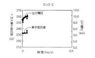 図4は、多数のTMR読出しヘッド素子について、上述した処理動作により、25mV印加時の第1の抵抗値R1及び150mV印加時の第2の抵抗値R2を測定し、抵抗変化率%VbdMRRを求めた結果を表すグラフである。ただし、同図の横軸はTMR素子抵抗値(この場合、第1の抵抗値R1に等しい)を、縦軸は抵抗変化率%VbdMRRをそれぞれ表している。また、図5〜図8は抵抗変化率%VbdMRR及び後述する抵抗変化率%dMRRによって決まる各ランクのTMR読出しヘッド素子について、150mVの電圧を印加した状態を長時間(12時間)継続し、そのTMR素子抵抗値及び出力電圧を求めた結果を表すグラフである。ただし、これらの図の横軸は時間を、縦軸はTMR素子抵抗値及び出力電圧をそれぞれ表している。4, the number of TMR read head element, by the processing operations described above, and measuring a second resistance valueR 2 at the time of the first resistance valueR 1 and 150mV applied at 25mV applied, the resistance change rate% VbdMRR It is a graph showing the result of having calculated | required. However, the horizontal axis of the figure represents the TMR element resistance value (in this case, equal to thefirst resistance value R1), and the vertical axis represents the resistance change rate% VbdMRR. 5 to 8 show a state in which a voltage of 150 mV is applied for a long time (12 hours) for each rank of the TMR read head element determined by the resistance change rate% VbdMRR and the resistance change rate% dMRR described later. It is a graph showing the result of having calculated | required the TMR element resistance value and the output voltage. In these figures, the horizontal axis represents time, and the vertical axis represents TMR element resistance value and output voltage.