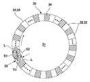 ここで、光ビームは、1つの光偏向領域32の半径方向における中心位置に入射することが好ましい。また、光ビームは、光偏向領域32での周方向におけるビームサイズが3mm以下であることが好ましく、周方向および半径方向のビームサイズのいずれもが3mm以下であることが好ましい。また、透過型光偏向ディスク30のディスク面には、薄膜あるいは微細構造などの反射防止処理が施されていることが好ましく、このように構成すると、レーザの出力ばらつきの原因となるレーザへの戻り光を非常に少なくすることができ、光量のロスも少ない。  Here, the light beam is preferably incident on the center position in the radial direction of one