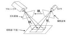 以上は、撮影画像と撮影平面との間のホモグラフィに関する考えだが、これは射影変換の関係がある平面間に適用できることが一般にも知られている。例えば、今、プロジェクタで投影面上に投影した投影表示結果をカメラで撮影するとした時、投影面と撮影画像の間、投影画像と投影面の間のホモグラフィをそれぞれ The above is the idea about the homography between the photographed image and the photographing plane, but it is generally known that this can be applied between the planes having a projective transformation relationship. For example, when the projection display result projected on the projection plane by the projector is now shot by the camera, the homography between the projection plane and the shot image, and the homography between the projection image and the projection plane, respectively.
