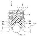 このことによって、保持部材22に対して把持部材5が回動自在に設けられる。このとき、把持部本体53に設けられている第1切り欠き部53aの内側面と高周波処置用部材54を構成する凸状部54dの側面とが当接する。これらのことによって、把持部本体53と高周波処置用部材54とは電気的に導通する。また、このとき、高周波処置用部材54と超音波処置用部材55とは56を軸にしてシーソーのように回動可能である。このため、二股形状把持歯部54aが摩耗した場合等においても、生体組織との当たり具合を変化させて確実な把持を可能にしている。 As a result, the gripping