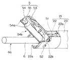 なお、把持部材5は例えば以下の手順で保持部材22に回動自在に取り付けられる。まず、把持部材5を構成する把持部本体53を保持部材22に回動自在に連結する。次に、高周波処置用部材54の配置用貫通孔54eに超音波処置用部材55の取り付け用突起部55aを配置して、高周波処置用部材54と超音波処置用部材55とを一体状態にする。そして、この一体状態において、高周波処置用部材54の凸状部54dを把持部本体53の第1切り欠き部53aに配置する。次いで、固定ねじ56によって高周波処置用部材54、及び超音波処置用部材55を把持部本体53に螺合固定する。 Note that the gripping
