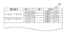図3に示すように、生体データベースファイル4Aは、電話番号等のグループ番号と、そのグループの複数のIDコードと、各IDコードに対応した生体データとを格納する。このグループ番号は、例えば、このグループが家族であれば、家の電話番号や、その中の特定の人の誕生日等、家族に覚えやすい番号であり、IDコードは、その家族の個々の人の個人コードである。  As shown in FIG. 3, the