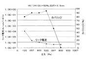 さらに、ハフニウムとシリコンの組成比を一定(例えばHf/(Hf+Si)=50%)にして、リーク電流およびカバリッジと基板温度との関係を図7に示した。図7では、左縦軸にリーク電流を示し、右縦軸にカバリッジを示し、横軸に基板温度を示す。 Further, FIG. 7 shows the relationship between the leakage current, the coverage, and the substrate temperature, with the composition ratio of hafnium and silicon being constant (for example, Hf / (Hf + Si) = 50%). In FIG. 7, the left vertical axis represents leakage current, the right vertical axis represents coverage, and the horizontal axis represents substrate temperature.