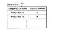 登録管理手段15Bは、携帯電話端末2からの定期的な端末登録要求をゲートウェイ3および通信I/F部12を介して受け付けて当該携帯電話端末2の端末登録ありを記憶部14の登録管理情報14Aへ記録する機能と、携帯電話端末2からの端末登録要求が所定期間以上受け付けられない場合は当該携帯電話端末2の端末登録なしを記憶部14の登録管理情報14Aへ記録する機能とを有している。なお、携帯電話端末2により端末登録については、例えば無線LAN通信方式を用いる場合、SIP(Session Initiation Protocol)などの公知の呼制御プロトコルに基づき端末登録が行われる。 The registration management means 15B accepts a periodic terminal registration request from the mobile phone terminal 2 via the gateway 3 and the communication I /