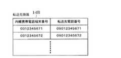 図3は、転送先情報の構成例である。ここでは、各携帯電話端末2の内線携帯電話端末番号と当該携帯電話端末2が電話制御装置1に対して未端末登録の際の転送先電話番号とが組として登録されている。この転送先情報14Bの転送先電話番号は、当該携帯電話端末2が携帯電話網5に接続した際に用いられる携帯電話番号からなり、例えば各携帯電話端末2から利用者により予め登録される。 FIG. 3 is a configuration example of transfer destination information. Here, the extension mobile phone terminal number of each mobile phone terminal 2 and the transfer destination phone number when the mobile phone terminal 2 is not registered in the