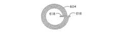 図34‐図40において、外科ステープル止め/切断器具10に組み込まれた別の代替のワインドアップ発射補助機構600は、ラチェット歯車606のねじりコイルバネ604に機械的位置エネルギーを蓄積するワインドアップつまみ602を含む。ラチェット歯車606は、同軸複平歯車(複歯車)140(図35および図36)の右側に同軸的に取り付けられた第3の平歯車605に噛合している。シャフト608が、ワインドアップつまみ602に連結され、右ハンドルハウジングシェル52を通過し、下方に付勢されたラチェット爪612を旋回可能に保持する円形フランジ610に取り付けられている。このラチェット爪612は、右から見るとラチェット歯車614の反時計周りの回転を防止するように、このラチェット爪612を回転可能に受容する、歯が傾斜したラチェット歯車614に係合している。ねじりコイルバネ604は、ラチェット歯車614に係合した外側端部616、およびシャフト608に係合した内側端部618を有する。平歯車620が、ラチェット歯車614とともに回転するために取り付けられ、同軸複平歯車(複歯車)140に付加された第3の平歯車605に噛合している。ラチェット歯車606の平歯車620に噛合している複平歯車140の右側に同軸的に取り付けられた第3の平歯車605は、補助機構500と発射駆動装置134との間の所望のギア比が得られる大きさにすることができる。代替の発射補助機構600は、ブレーキ組立体340または440を利用することができる。 34-40, another alternative windup firing
