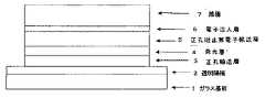 有機EL素子は、[図4]に示すように、ガラス基板1上に透明陽極2としてITO電極をあらかじめ形成したものの上に、正孔輸送層3、発光層4、正孔阻止層兼電子輸送層5、電子注入層6、陰極(アルミニウム電極)7のに蒸着して作製した。