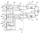 スイッチ群T1は、端子2100および端子2110を、端子2500に選択的に接続する。スイッチ群T2は、端子2200および端子2210を、端子2510に選択的に接続する。スイッチ群T3は、端子2300および端子2310を、端子2500に選択的に接続する。スイッチ群T4は、端子2330および端子2340を、端子2510に選択的に接続する。スイッチ群T1,T2,T3,T4は、コントローラ2200の制御により、次の2状態のいずれかになる。あるときは、スイッチ群T1およびスイッチ群T2の各スイッチはオンであり、スイッチ群T3およびスイッチ群T4の各スイッチはオフである。また、あるときは、スイッチ群T1およびスイッチ群T2の各スイッチはオフであり、スイッチ群T3およびスイッチ群T4の各スイッチはオンである。コントローラ2200自身は、端子2400を介して受信する制御情報に応じて動作する。  The switch group T1 selectively connects the terminal 2100 and the terminal 2110 to the
