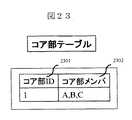 関係ネットワークからコア部を抽出するステップS12では、関係ネットワークを入力とし、前記関係ネットワークから関係の密度の高いコア部を抽出して出力する。コア部抽出手法には、グラフ理論におけるN-Clique、K-Plex(非特許文献2)、SR法(非特許文献1)などを適用できる。このコア部の集合は、コミュニティ形成の種として用いられる。例では、図22の関係ネットワークを入力とし、全てのノード間にエッジの存在するサブグラフである1-Cliqueをコア部として抽出すると、(A,B,C)の3名からなるコア部が抽出される。コア部は、図23のコア部テーブルによって管理される。2301はコア部ID、2302はコア部を形成するメンバを表す。 In step S12 for extracting the core part from the relation network, the relation network is taken as an input, and the core part having a high relation density is extracted from the relation network and output. N-Clique, K-Plex (non-patent document 2), SR method (non-patent document 1) and the like in graph theory can be applied to the core part extraction method. This set of core parts is used as a seed for community formation. In the example, if the relational network in FIG. 22 is input and 1-Clique, which is a subgraph in which edges exist between all nodes, is extracted as a core part, a core part consisting of three persons (A, B, C) is extracted. Is done. The core part is managed by the core part table of FIG. 2301 represents a core part ID, and 2302 represents a member forming the core part.