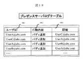 次に、図13を用いて、プレゼンスサーバの機能を説明する。プレゼンスサーバ902は、情報送受信機能1304のプレゼンス情報送受信部1305によって、情報端末のプレゼンス情報を受信し、その情報を、プレゼンス情報・バディリスト情報管理機能1301のプレゼンス情報管理部1302によって管理する。また、バディリスト関連情報送受信部1306によって、情報端末のバディリスト追加削除操作の情報を受信し、その情報を、バディリスト管理部1303によって管理する。プレゼンス情報・バディリスト情報は、図18のプレゼンスサーバログテーブルのような形式で管理される。1801はユーザIDである。1802はユーザの行動内容である。1803は行動内容の詳細である。 Next, the function of the presence server will be described with reference to FIG. The