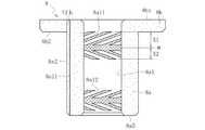 スリーブ部8aの内周面8a1には、図3に示すように、軸方向に離隔した2箇所の領域に、ラジアル動圧発生部として、ヘリングボーン形状に配列した動圧溝8a11、8a12が形成される。また、フランジ部8bの上側端面8b1には、図4に示すように、スラスト動圧発生部として、スパイラル形状に配列した動圧溝8b11が形成される。 On the inner peripheral surface 8a1 of the