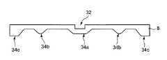 また天板部材8としては、これを構成する誘電体板の板厚が全面に亘って均一に形成されている場合もあるが、処理空間Sの面内方向におけるプラズマ密度の均一化を図るために天板部材8には種々の工夫がなされている。例えば図9にも示すように(特許文献5参照)、天板部材8の中心部の大気側(上面側)には、この部分におけるマイクロ波をキャンセルして電界集中を避けるための凹部32が形成されると共に、天板部材8の下面側には、その中心部、中周部及び外周部に、それぞれ断面台形状、或いは三角形状になされた突起部34a、34b、34cを設けてマイクロ波に対する共振領域を形成するようにし、低い圧力から高い圧力に亘って安定したプラズマを発生できるようになっている。 Further, as the