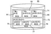 図5を参照すれば、記憶領域65のユーザ記憶領域部71には、ユーザA、B、C、D、E、Fがアクセス可能に特定アクセス権限情報が設定されたボックス73、そしてそのボックス73の中には、ユーザA、B、Cがアクセス可能に特定アクセス権限情報が設定されたボックス75、ユーザB、E、Fがアクセス可能に特定アクセス権限情報が設定されたボックス77、ユーザA、D、E、Fがアクセス可能に特定アクセス権限情報が設定されたボックス79、が設定されている。  Referring to FIG. 5, the