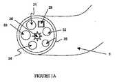 スペクトル測定は、内視鏡2と検出システムの間に設けたスペクトルアタッチメント10を使用することで実行される。光ファイバ11は分光分析のため帰還放射の部分を画像平面のスポットからのスペクトロメーター5まで運ぶ。プローブ3の遠位端は図1にさらに詳細に示される。図1Aの断面図に示すプローブ3は、目標物(図1の組織6などの)に尋問放射を運ぶために1つ以上の光ファイバー照明ガイド21と、組織6から帰還放射を運ぶためのイメージバンドル22を通常含む。プローブ3はまた、生体組織検査他の手術方法のための器具チャンネル23、目標の洗浄のための水管24及び吸引のための気管25を含んでいる。さらに、器具チャンネル23は、光学コンピュータトモグラフィー、ラマン分光法、共焦点顕微鏡法、エンド顕微鏡法、レーザ又はドラッグ治療、遺伝子療法、注射、マーキング、インプラントク他の医術などの他の医療のためのアクセスを提供できる。蛍光画像、蛍光分光法、光コヒーレンストモグラフィー法、ラマン分光法、共焦点顕微鏡法又は白色光反射率画像法などの第2画像診断法を散乱反射率分光診断法に組み合わせることができる。 The spectrum measurement is performed by using a