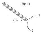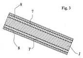 次に図2及び3を参照すると、変形体1には、その内部に少なくとも2つの光ファイバ・センサ7が配置されていて、変形体1の変形がセンサ7に伝達されるようになっているのが望ましい。変形体の中立軸の位置が分かっているか、あるいは、製造中に決定される限りにおいて、2つの光ファイバ・センサを用いることが可能である。変形体1は、少なくとも3つの光ファイバ・センサを組み込んでいて、一般に、ガイド・ワイヤまたはカテーテルの製造に用いられるような、成形、機械加工、または、押し出し加工を施された材料を含むのがより望ましい。光ファイバが変形体1の一体部分を形成することを確実にするため、接着剤または、例えば、オーバモールドまたは共押出しのような他の手段を利用して、光ファイバを変形体内に固定することが可能である。図3において、光ファイバ7は、接着剤8を用いて、変形体1内に接着されている。  Next, referring to FIGS. 2 and 3, at least two