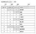 図5は、図1のデータ入力支援システムにおけるDBのテーブルの一例を示す図である。図5において、DBのテーブル500は、データの大分類501と、データの中分類502と、データの小分類503と、データの内容504とから主としてなり、データの内容504は、例えば画面に表示される名称である。なお、テーブルの構成及びそのデータの内容は特に限定されるものではなく、用途や目的に応じて種々の構成及び内容が適用される。  FIG. 5 is a diagram showing an example of a DB table in the data input support system of FIG. In FIG. 5, a DB table 500 is mainly composed of a data