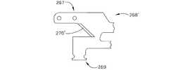 種々の実施形態において、エンドエフェクタ組立体は切開部材を含むことができ、この切開部材は一つ以上の支持体の要素を切開するよう構成できる。少なくとも一つの実施形態では、切開部材は手術器具発射駆動部によってエンドエフェクタに対し起動され、エンドエフェクタのアンビルおよび/またはステープルカートリッジ内の切開部材スロットに案内される。少なくとも一つの実施形態では、図19を参照すると、切開部材268の上部267はアンビル内のスロット内をスライドするよう構成され、加えて、切開部材の下部269はステープルカートリッジ内のスロット内をスライドするよう構成される。種々の実施形態において、切開部材268はブレード270を含むことができ、このブレード270は右上がりの傾斜を有し、すなわち、刃先の下端が上端の遠位側に位置している。少なくとも一つの実施形態では、この構成は支持体を遠位側に実質的に押すことなく、またエンドエフェクタ内の支持体の整合を乱すことなく、支持体を切開するよう構成されている。少なくとも一つの別の実施形態では、図20を参照すると、切開部材268’のブレード270’は右下がりの傾斜となっており、すなわち、刃先の下端が上端の近位側に位置している。さらに別の実施形態では、図21を参照すると、切開部材268’’のブレード270’’は、右上がりの傾斜を有する第一部分270a’’と、右下がりの傾斜を有する第二部分270b’’とを有する。 In various embodiments, the end effector assembly can include a cutting member that can be configured to cut one or more support elements. In at least one embodiment, the cutting member is activated relative to the end effector by the surgical instrument firing drive and is guided to the cutting member slot in the end effector anvil and / or staple cartridge. In at least one embodiment, referring to FIG. 19, the