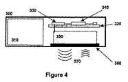 [0042]図4は、ハウジング300の側面図を示し、これは、上面図を示した図3と類似している。電池310は、ハウジングに電力を供給する。電力は、電子回路基板320上のマイクロプロセッサ330および二方向ページャ340と、超音波レンジセンサ350とに供給される。低コストの超音波レンジセンサの一例が、PING超音波センサ(Parallax(商標) Corporation)であり、これは、マンホールの深さのほとんどをカバーする、約11フィートの最大距離までの距離情報を提供する。超音波センサ350の前に防水または耐水性のカバー360が配置され、カバー360は、センサ350の性能に悪影響を及ぼさない。超音波センサ350は、ほぼ、10分に1回の間隔でオンになり、超音波370で距離測定を行う。距離測定結果が通常と異なることが判明した場合は、ページャ340から無線ネットワークに信号が送信される。 [0042] FIG. 4 shows a side view of the