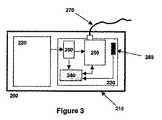 [0039]図3は、ハウジング200の各コンポーネントの好ましい概略レイアウトの上面図である。ハードウェアのすべてのコンポーネントが、たとえば、Hoffman,Anoka,MNによって製造されるNEMA−4、またはそれ以上の規格のエンクロージャ210にパッケージされ、エンクロージャ210は、堅牢であって、耐水性を有し、環境に対して密封されている。図3では、電池の体積に対する電池の容量(アンペア時(A−H))を最大化するために、大容量電池220が選択されている。本発明の好ましい実施形態に使用可能な、典型的な電池は、一次リチウム電池である。たとえば、約10 A−Hの6V供給は、市販標準品の電池、たとえば、Duracell(商標) CorporationのDuracell(商標) Lithium Model 245を使用して、3Vの単3リチウム電池の4つの直列ペアを並列接続して構築できる。ハウジング200の標準的な電流引き込みの合計の目標が約2ミリアンペア(mA)であれば、約10 A−Hの容量の電池パックで、6ケ月以上の連続動作に十分な電力を供給することが可能である。代替の一次電池タイプは、標準的なアルカリ電池である。低コストで小さいパッケージサイズの用途のための電源として一次電池220が選択されているが、本発明は、このタイプの電源に限定されない。外部ACまたはDC電力が容易に利用可能であれば、それらで代用することが可能であり、また、ニッケル水素電池などの充電式電池を、日中に電池を充電するための適合物(太陽電池など)からの低電流細流充電と組み合わせて使用することも可能である。 [0039] FIG. 3 is a top view of a preferred schematic layout of each component of the