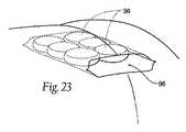図23が示す通り、外科的に形成されたポケット96は、所定のインプラント(例えば、図8Aに示すインプラント36)の横及び縦の寸法に関して、横はきついが縦は緩く形成されてもよい。図23は、例示の目的で、インプラント36が図8Aに示すタイプであるように示すが、ポケット96は、他のタイプのインプラントを収容する大きさとすることができる。ポケットの寸法は、インプラント36の前後の動きに適応するが、インプラント36の横の動きを制限する。ポケットの寸法は、インプラントの移動を阻止する一方で、インプラント36が通常の活動中に組織、例えば舌、と共に動くことを可能にする。(9. Surgical pockets with special dimensions)