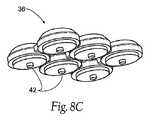 図8Cは、組織を捉えるために凹凸のある裏面42即ち「底面トレッド」を有する図8Aに示すタイプの磁性インプラント36を示す。インプラント36(又は一般に任意のインプラント)の安定化は、以下により詳細に記載する通り、例えば、縫合糸又はステープル又は糊を使用するインプラント部品の下にある組織への装着により達成することができる。トレッド42は、組織に対する動きを制限し、速やかな治癒を促す。(3. Integrated protrusion for soft tissue fixation)