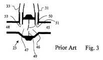 図3には、公知の流量センサ23の断面が概略的に図示されている。流量センサ23は、吸込用接続部45と、第1のチャンバー46と、第2のチャンバー47と、排出用接続部とをケーシング内に有している。第1及び第2のチャンバー46,47はダイヤフラム49により切り離されている。このダイヤフラム49は、開口部と、該開口部を塞ぐフラップ50とを有している。フラップ50は開き戸のように回動可能に構成されており、その結果フラップ50は、呼吸空気の流れがどの方向に向いているかに応じて一方のチャンバー内又は他方のチャンバー内へ進入することができる。流量センサ23は左右対称に構成されており、その結果流量センサ23は、呼吸空気が前記開口部を貫流する結果発生する圧力降下を両方向において測定することができる。前記チャンバー内の圧力はエアチューブ31,33を介して人工呼吸器に供給され、人工呼吸器内で測定される。前記圧力降下に基づいて人口呼吸器は呼吸空気内の圧力比と呼吸体積とを算出することができる。この算出は、実際には、流量センサと人工呼吸器13との間でどの程度の漏れがあるかに関係なく行なわれ、非常に代表的なものである。  FIG. 3 schematically shows a cross section of a known