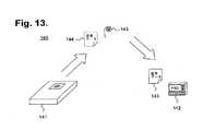 受動的な認証は、IMD、植え込み型センサ、または植え込み型識別タグ等、患者14に植え込まれたデバイスによって概して利用可能である、検出可能なしるしを必要とする。図9、11、および13は、植え込み型医療機器103、123、143による患者識別100、120、140を示す機能ブロック図である。植え込み型医療機器自体が、患者IDを確認するデバイスとしての役割を果たすため、別個の入力デバイスは必要とされない。図10、12、および14は、植え込み型医療機器103、123、143による患者識別110、130、150を示す工程図である。検出可能なしるしを収納する植え込み型デバイスを、一般に植え込み型医療機器と称するが、これには植え込み型センサ、植え込み型識別タグ、および、遠隔検出によって患者14と一意的に関連付けられ得るその他の形態の植え込み型デバイスも含む。  Passive authentication requires a detectable indicia that is generally available by a device implanted in the