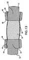 図1及び2は脊椎を動的に固定するために役立つ動的脊椎安定器10を示している。動的脊椎安定器は複数のロッド12及び1つのたわみ部材を含む。ロッド12は、細長い構造を含むことができる。この細長い構造は中実または中空であり、任意の希望の断面を持つことができる(例えば、円形、楕円形、正方形、長方形など)。ロッド12は直列に配列され、たわみ部材14は隣り合うロッド12の間に配列される。たわみ部材14は織物シース16及び弾性プラグ18を含む。織物シース16の両端20は隣り合うロッド12のそれぞれの端22に接続される。織物シース16の両端20は適切で確実な取付け(例えば、クリンピング、接着剤、溶接など)によって隣り合うロッド12のそれぞれの端22に接続される。織物シース16は生体適合性材料で作られ、たとえば織り、網またはシース構造を与えるその他の形態である。弾性プラグ18は織物シース16のルーメン24に配列され(例えば図5に示されるように)、隣り合うロッド12の端22の間に配置される。  1 and 2 illustrate a