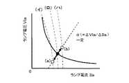 先述した演算手段10のΔVla/ΔIlaというのは、バラストのV−I特性の傾きを演算していることに他ならない。したがって、このΔVla/ΔIlaが一定に制御される場合、バラストのV−I特性は図2の(a)や(b)で示すような傾きが一定の直線になる。ランプ点灯時の動作点は、ランプのV−I特性とバラストのV−I特性の交点であるので、図中の(a)と(c)の交点や(b)と(c)の交点が点灯時の動作点となる。 The aforementioned ΔVla / ΔIla of the computing means 10 is nothing but computing the slope of the ballast VI characteristic. Therefore, when this ΔVla / ΔIla is controlled to be constant, the V-I characteristic of the ballast is a straight line having a constant slope as shown in (a) and (b) of FIG. Since the operating point when the lamp is lit is the intersection of the VI characteristic of the lamp and the VI characteristic of the ballast, the intersection of (a) and (c) or the intersection of (b) and (c) in the figure is This is the operating point when lit.