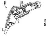 図5(b)は、図3(b)で提供された側面図とは反対側の部分的断面の側面斜視図である。図5(b)は、図3(b)の図から隠されている、ハンドル1103の付加的な構成要素を図示する。ここで図5(b)を参照すると、関節運動歯車軸685が示されている。関節運動歯車軸685の近位端は、ハンドル1103の固定内壁(透視で示される)の開口内で回転可能に載置され、ハンドル1103の固定内壁は、関節運動歯車軸685の長手軸と略垂直である。関節運動歯車軸685の遠位端は、ハンドル1103の別の固定内壁(同様に透視で示される)の開口内で回転可能に載置され、このハンドル1103の固定内壁も、関節運動歯車軸685の長手軸と略垂直である。関節運動歯車軸685は、その近位端に隣接した長さに沿って、関節運動平歯車687を含む。関節運動平歯車687は、外周の歯車の歯6871を有する。関節運動平歯車687の外周の歯車の歯6871は、関節運動平歯車629の外周の歯車の歯6291と咬み合って係合される。関節運動歯車軸685はまた、その遠位端に隣接した長さに沿って、関節運動ウォーム歯車689も含む。関節運動ウォーム歯車689は、外周のウォーム歯車の歯6891を有する。 FIG. 5 (b) is a side perspective view of a partial cross-section opposite to the side view provided in FIG. 3 (b). FIG. 5 (b) illustrates additional components of the